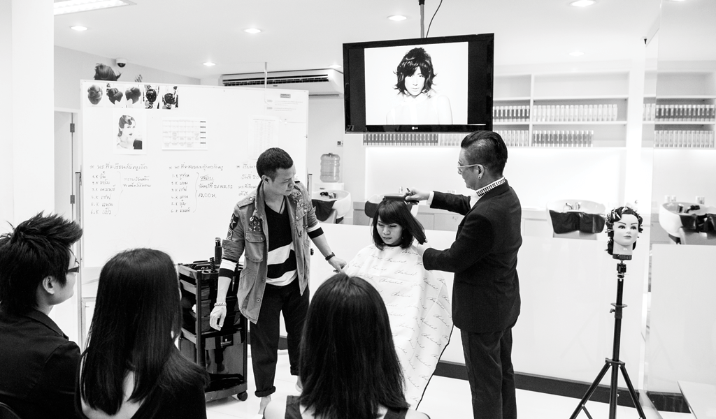 Our programs are based on the programs of the Office of the Private Education Commission under the Ministry of Education. We also use the new model of teaching from the dissertation in “Development of Thai Hairdresser Profession Standard” by Dr. Somsak Chalachol, which is an efficient guideline and covers all knowledge needed to be a successful professional hairdresser. In addition, we analyze programs of other well-known hairdressing schools in Thailand and abroad, and adapt their strengths to our program. Thus, our program includes the four keys for hairdressing profession: attitudes, skills, services and management.